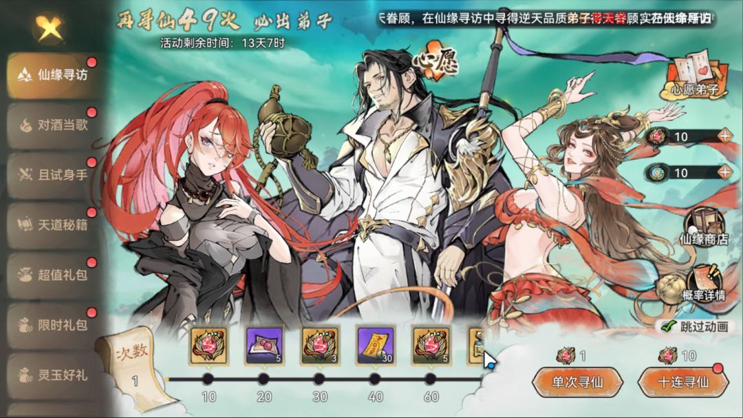 首先,还是关注仙缘寻访,前期仙玉的主要用途都是抽取这里的活动弟子,推荐顺序李清圣秦冰唐蝶衣。